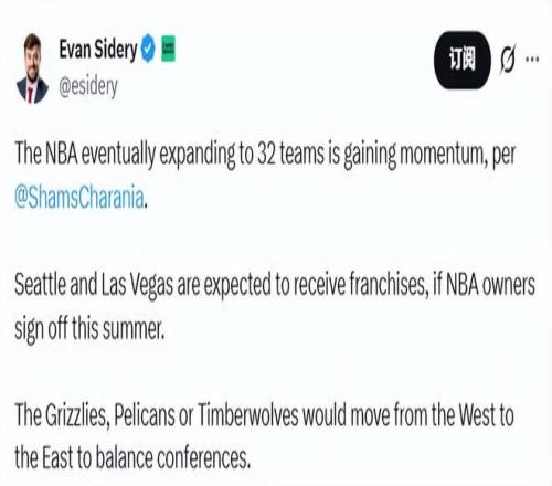 北京時間2月13日,據名記Shams報道,NBA最終擴軍至32支球隊的趨勢正在增強。如果NBA老板們今年夏天批準,西雅圖和拉斯維加斯有望獲得特許經營權。為了平衡東西部實力,灰熊、鵜鶘和森林狼中的一隊將從西部遷至東部。