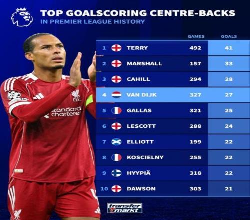 德國轉會市場統計了英超歷史上中后衛進球數據排名,約翰·特里41球居首,范戴克27球第四。