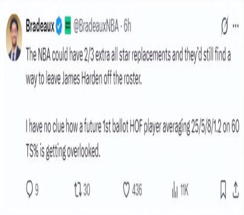 火箭記者Bradeaux寫道:就算NBA能再安排2-3名全明星替補(bǔ),我相信他們依舊會(huì)想辦法將詹姆斯-哈登排除在全明星陣容之外。