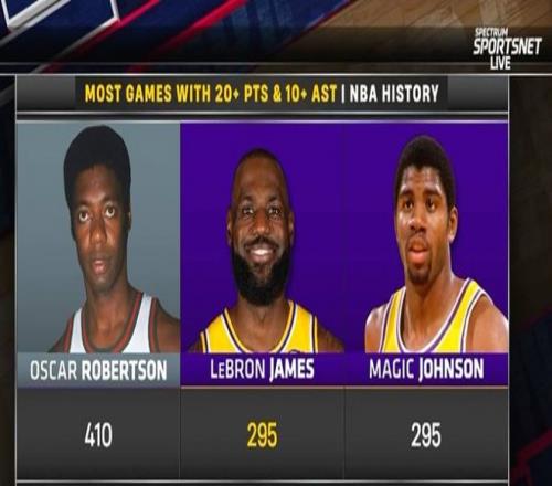 第三,歷史20分10助場次榜:大O以410場排名第一,詹姆斯295場與魔術師并列第2。