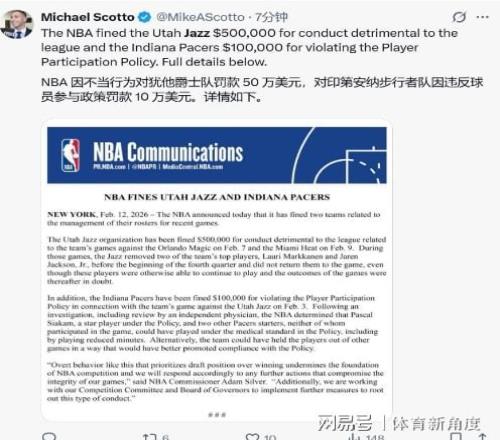 面對輿論風(fēng)暴,NBA官方于北京時間9時30分重拳出擊:爵士因連續(xù)兩場第四節(jié)惡意輪休3J與馬爾卡寧被處以50萬美元罰款,步行者則因違規(guī)輪休西亞卡姆遭罰10萬美元(兩隊傷病報告均違反聯(lián)盟新輪休規(guī)定)。聯(lián)盟同步發(fā)布嚴(yán)正聲明:"任何為追求選秀權(quán)益而公然犧牲比賽公正性的行為,都將動搖NBA的競技根基。"