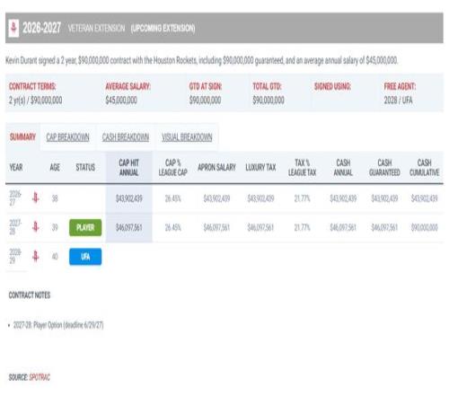 杜蘭特此前與火箭隊達成了兩年9000萬的提前續約,他本賽季的薪水是5470萬,26-27賽季4390萬,27-28賽季4609萬(球員選項),這份合同結束后他因為38歲條款就只能一年一簽,他的薪資也必然會迎來大幅度的下滑,因為這份合同執行完他就39歲(也有可能退役)。
