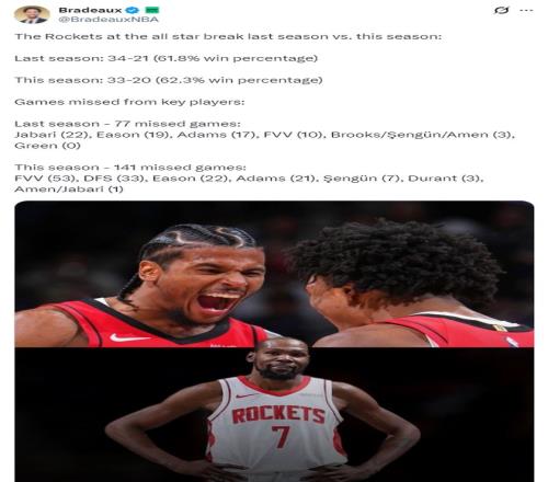 火箭記者Bradeaux曬出了一項數據對比,他認為杜蘭特的加盟并沒有讓火箭更壞,火箭本賽季的戰績沒有達到外界的理想預期跟傷病有關。