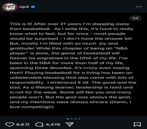 北京時間2月14日凌晨,40歲的NBA名人堂球員克里斯·保羅在其個人社交媒體上宣布正式退役,結束其21年的職業生涯。