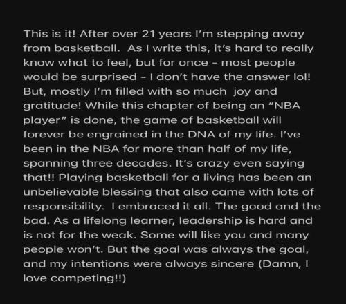 走過21年多的旅程之后,我決定離開籃球賽場,結束職業生涯。