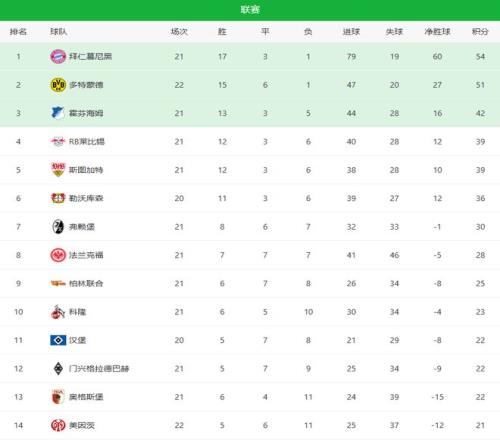 下面是德甲最新積分榜!