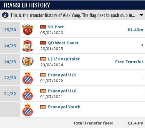 他曾隨西班牙人U14A隊(duì)奪得加泰羅尼亞聯(lián)賽冠軍,在地中海杯等賽事中擔(dān)任主力,擁有純正歐洲足球青訓(xùn)背景。2024年8月,楊希轉(zhuǎn)投半職業(yè)的西協(xié)丙聯(lián)賽球隊(duì)奧斯皮塔萊特,24-25賽季坐板凳0出場。