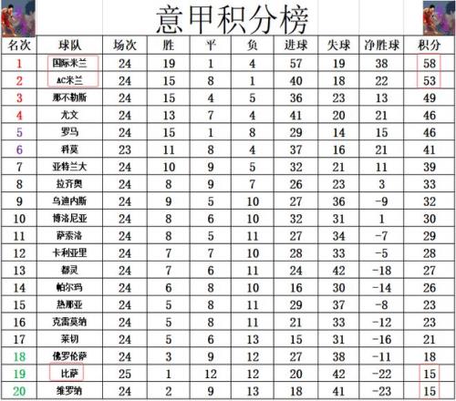 積分榜方面,AC米蘭今天先賽贏球,現在他們和國米都是賽了24輪,AC米蘭5分之差繼續位居第2,緊追榜首的國米。那不勒斯49分排在第3,尤文,羅馬46分排在第4,第5。