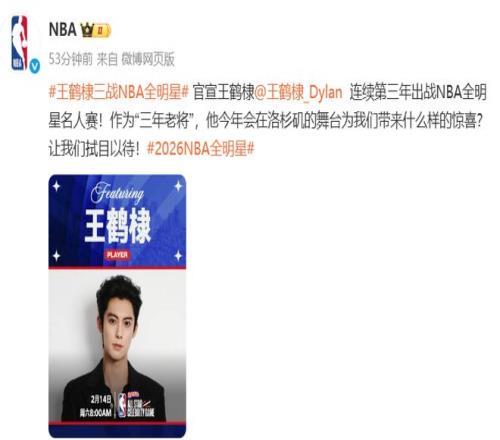 隨后NBA官方微博也同步發(fā)布了相關(guān)消息,官宣王鶴棣連續(xù)第三年出戰(zhàn)NBA全明星名人賽,并稱他為“三年老將”,期待他在洛杉磯舞臺上為我們帶來驚喜。