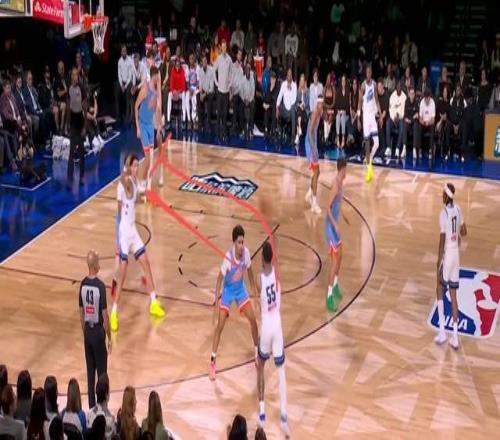 楊瀚森第四個球,則是展現小里弗斯(楊瀚森所在隊伍的主教練)的戰術水準,尼德豪澤低位要球,后衛傳給尼德豪澤之后迅速去底線給楊瀚森做一個掩護死死擋住克林根,楊瀚森擺脫之后接到尼德豪澤的傳球,利用身高差打進勾手。