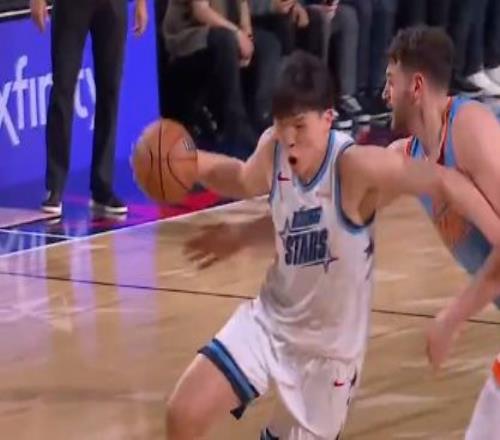 之后面對隊友克林根,楊瀚森持球大跨步晃開大根完成上籃。