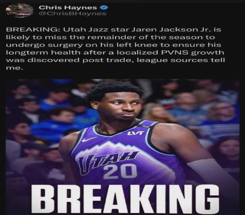 “3J”小賈倫-杰克遜將接受手術,切除左膝一處局部色素沉著絨毛結節性滑膜炎增生組織,可能賽季報銷......