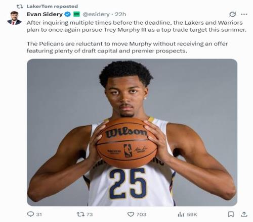 北京時間2月14日晚,湖媒Laker Tom也透露,在2026年休賽期湖人隊有引進三年1.12億合同的墨菲的打算。
