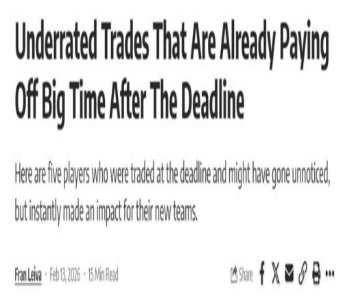 美媒認為5筆被低估的小手筆交易已經開始發力!湖人2換1拿下神射,勇士舊將1換1赴猛龍獲重生,火箭隊錯失補強1號位撿漏良機。