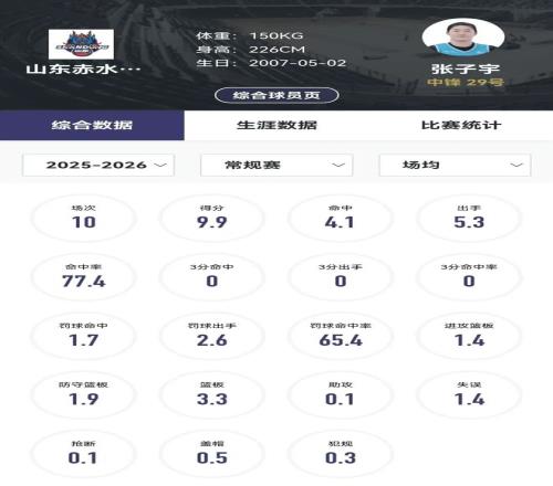 張子宇WCBA職業生涯第一個賽季的數據最后定格在了十場比賽,場均8.5分鐘,得9.9分3.3籃板0.1助攻0.5蓋帽1.4失誤。