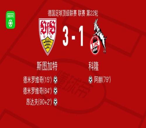 北京時(shí)間2月15日德國(guó)足球頂級(jí)聯(lián)賽 聯(lián)賽 第22輪,斯圖加特主場(chǎng)對(duì)陣科隆。斯圖加特德米羅維奇梅開二度,昂達(dá)夫破門。科隆阿赫破門。最終比分斯圖加特 3-1 科隆。
