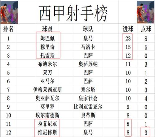 射手榜方面,姆巴佩缺陣,還是23球領(lǐng)跑,穆里奇15球位列第2,托雷斯12球排在第3。維尼修斯今天無緣帽子戲法,但是點射梅開二度后,他追上了拉菲尼亞和埃爾南德斯,8球剛好擠入前十。