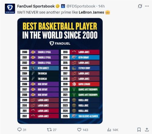 美媒FanDuel曬出了自2000年后聯盟最出色的球員,2000-2002年奧尼爾、2003年加內特、2004-2005年鄧肯,2006-2008年科比,2009-2013年詹姆斯,2014年杜蘭特,2015年詹姆斯,2016年庫里,2017-2018年詹姆斯,2019年倫納德,2020-2021年揚尼斯,2022-2024年約基奇,2025年SGA。詹姆斯一人有八次,美媒寫道:我們再也不會見到勒布朗這個級別的球員了。