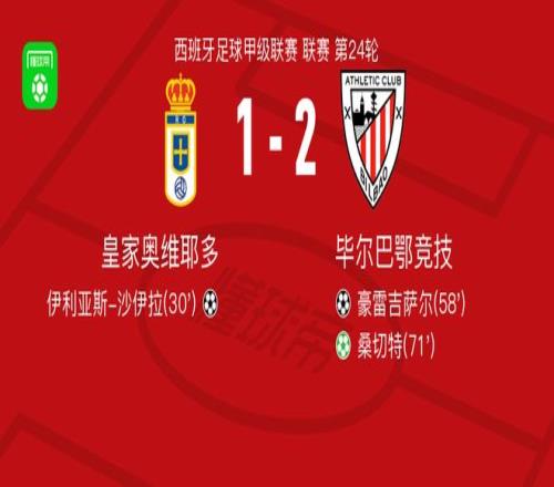 北京時間2月15日西班牙足球甲級聯賽 聯賽 第24輪,皇家奧維耶多主場對陣畢爾巴鄂競技。皇家奧維耶多伊利亞斯-沙伊拉破門。畢爾巴鄂競技豪雷吉薩爾破門,桑切特破門。最終比分皇家奧維耶多 1-2 畢爾巴鄂競技。