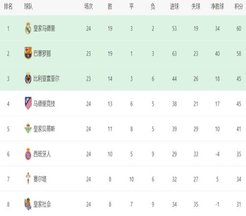 在積分榜上,皇馬以60分排名榜首。皇馬的戰(zhàn)績是19勝3平2負(fù)。巴薩則以58分屈居第2名。不過,巴薩比皇馬少踢1輪,接下來有機(jī)會重登榜首。比利亞雷亞爾45分排名第3。馬競慘敗之后,依然是45分,但凈勝球比比利亞雷亞爾少,跌到了第4名。皇家貝蒂斯贏球后,總積分是41分,繼續(xù)縮小與身前球隊(duì)的差距,排名第5,距離歐冠區(qū)越來越近。西班牙人拿到35分,排名第6。