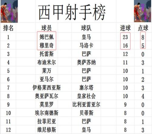 射手榜方面,姆巴佩23球繼續領跑,穆里奇今天打入一球,將和姆巴佩的差距縮小到7球。第3的托雷斯落后姆巴佩就有點多了,差了11球之多。埃爾南德斯,拉菲尼亞和維尼修斯8球剛好擠入前十。