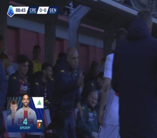比賽末段,熱那亞主帥德羅西讓替補席上的亞歷山德羅-阿莫林起身,準備換下弗倫德魯普。轉播圖像顯示了兩人的名字與照片:弗倫德魯普配的是本人照片,但阿莫林那一欄卻“畫風不對”——頭像并非年輕的熱那亞中場亞歷山德羅-阿莫林,而是前曼聯主帥魯本-阿莫林,他不久前剛被曼聯解雇。