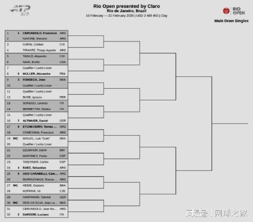 ATP500巴西里約站:前四號種子分別是F-塞倫德羅、達爾德里、豐塞卡、巴埃斯。貝雷蒂尼、埃切維里、塔比洛等球員也將連續兩周出戰。