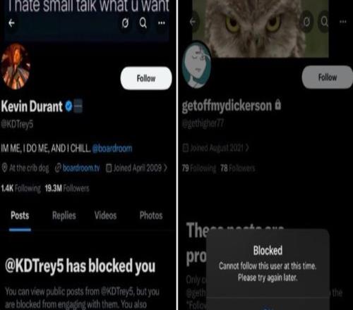 北京時間2月16日,有一位網友在社媒上爆料有一個名為‘getoffmydickerson’的賬號疑似是凱文-杜蘭特的小號,因為杜蘭特的大號與這個getoffmydickerson賬號都將他拉黑了,他就覺得這個getoffmydickerson是杜蘭特小號,而這個getoffmydickerson多次語出驚人。