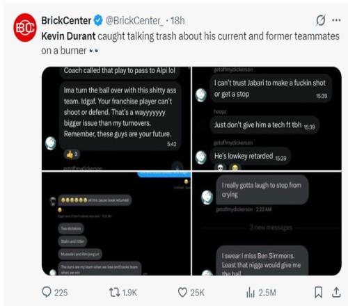美媒BrickCenter也爆料了疑似杜蘭特小號的事件,因為這個賬號在社媒上各種炮轟杜蘭特的前隊友、現(xiàn)隊友。