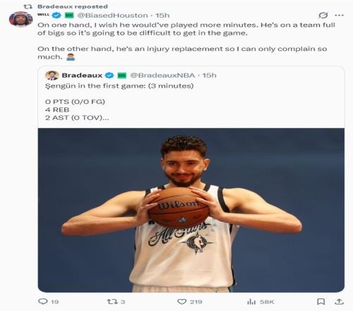 休媒Will發(fā)聲:一方面我希望他能上更多的場(chǎng)次。他所在的球隊(duì)中有多位內(nèi)線球員,所以他要進(jìn)入主力輪換會(huì)很困難。另一方面他只是替補(bǔ)球員,所以我只能抱怨他的戲份太少。