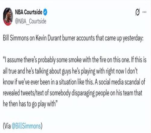 名嘴比爾-西蒙斯也在播客節目上談到了近期爆出的杜蘭特小號事件:“我覺得這事無風不起浪。如果全是真的,而且他在吐槽現在還在并肩打球的隊友,那我們可能從沒見過這種局面 —— 社交媒體丑聞曝光,實錘他在貶低自己的隊友,轉頭還得跟他們一起打球。”