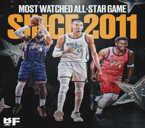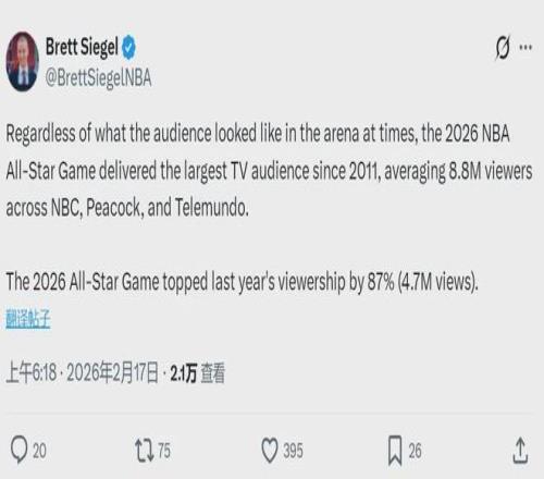 北京時間2月17日,據NBA記者Brett Siegel報道,2026年NBA全明星正賽收視人數公布:在NBC、Peacock和Telemundo三大平臺平均觀眾人數達到880萬,創下自2011年以來,近15年全明星正賽的最高收視紀錄,比2025年(470萬)暴漲了87%。