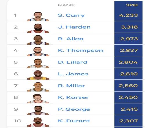 目前的NBA歷史三分榜上,現(xiàn)役球員占了7位,其中前四分別就是庫里、哈登、湯普森、利拉德。