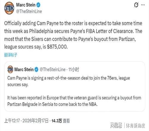 北京時間2月17日,恰逢農歷大年初一,在此先給各位球迷朋友拜個年!雖然最近三天NBA賽事暫歇,但聯盟的動態依舊精彩紛呈。今日,據知名NBA記者Marc Stein透露,76人隊即將簽約后衛卡梅隆-佩恩,這一消息無疑為節日增添了幾分喜慶。