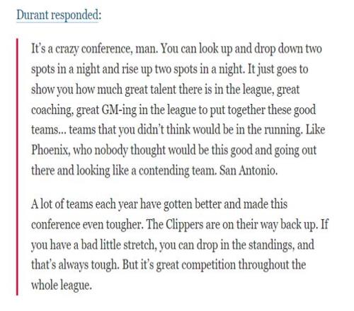 杜蘭特對西部格局的評價卻值得一看,杜蘭特說道:西部真的很瘋狂,也有可能一夜之間排名上升或下降兩位,西部存在聯盟多位頂級球員/教練/GM,他們都組建了優秀的球隊。原本覺得不是爭冠球隊的太陽、馬刺本賽季都發揮出色。每年都有球隊進步讓這個聯盟競爭更激烈,快船都在復蘇,西部會非常之激烈。