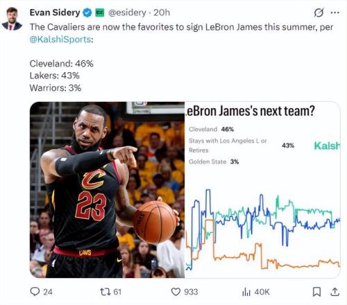 北京時(shí)間2月17日,《福布斯體育》記者埃文-斯迪瑞根據(jù)數(shù)據(jù)媒體Kalshi的統(tǒng)計(jì)曝出了勒布朗-詹姆斯今夏潛在下家的概率:騎士46%、湖人43%、勇士3%。