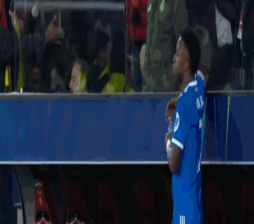 第90+12分鐘,維尼修斯準備主罰角球,被球迷投擲的物體擊中