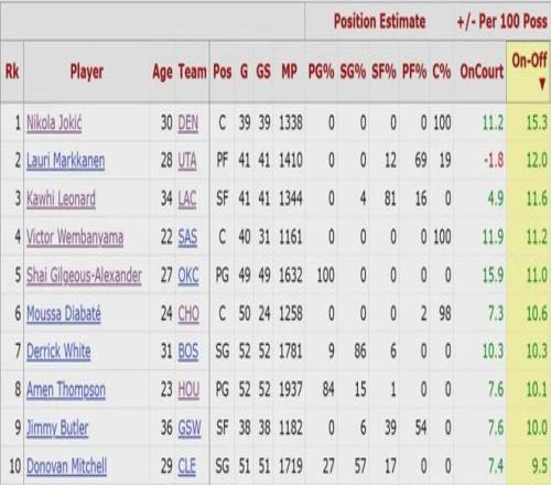 本賽季NBA球員on-off值(在場與離場時百回合正負值的差值),前五名如下:1、約基奇,15.3;2、馬爾卡寧,12;3、倫納德,11.6;4、文班亞馬,11.2;5、亞歷山大,11。沒想到吧?馬爾卡寧居然能排聯盟第二!
