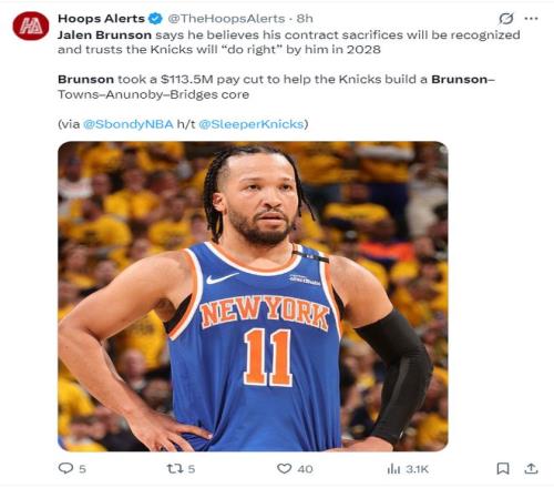 布倫森希望在2028年夏成為自由球員時公正的對待他下一份合同,因為他主動接受了大幅度降薪來幫助尼克斯組建布倫森、布里奇斯、阿奴諾比、唐斯的核心陣容。