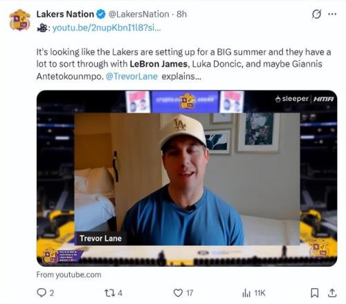 根據(jù)湖人記者Trevor Lance的分析,湖人隊今夏會迎來一個輝煌的夏天,他們需要處理好詹姆斯的合同,東契奇、揚尼斯的潛在合作也是一個契機。Trevor Lance也認為今夏詹姆斯有離隊的可能性,因為湖人隊會要求詹姆斯接受大幅度的降薪,甚至希望詹姆斯接受老將底薪,這樣才能交易、先簽后換一個超級巨星。