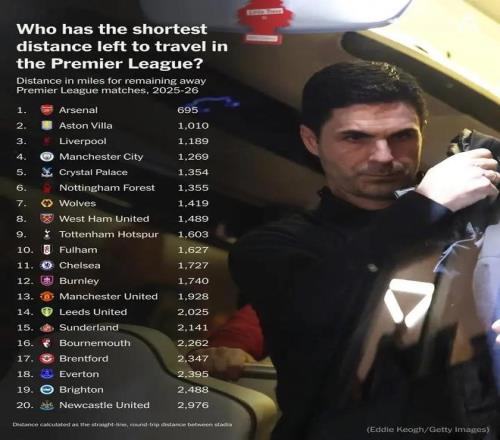 英超聯(lián)賽26輪戰(zhàn)罷,爭冠局勢將進(jìn)入白熱化階段。日前,The Athletic計(jì)算了英超各支球隊(duì)剩余聯(lián)賽賽程的客場旅程總距離,結(jié)果顯示阿森納是20支英超球隊(duì)中,本賽季剩余旅程最短的球隊(duì)。