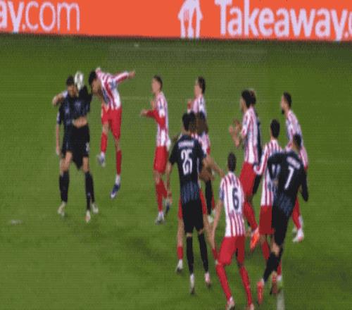 上半場第8分鐘,阿金·塞防守過程中不慎手球,裁判觀看VAR后,判罰點球。阿爾瓦雷斯操刀,一蹴而就。