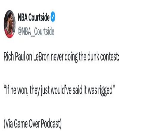 里奇-保羅在自己的《Game Over》播客節目中大膽斷言,如果詹姆斯當年真的參加并贏下扣籃大賽,外界會是什么反應。“如果他贏了,人們只會說比賽是暗箱操作的。”保羅說道。