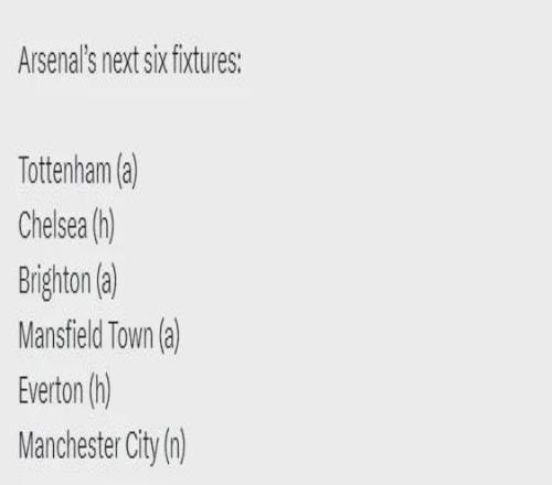 阿森納未來6場比賽:客戰熱刺、主戰切爾西、客戰布萊頓、客戰曼斯菲爾德、主戰埃弗頓、卡拉寶杯決賽對曼城。
