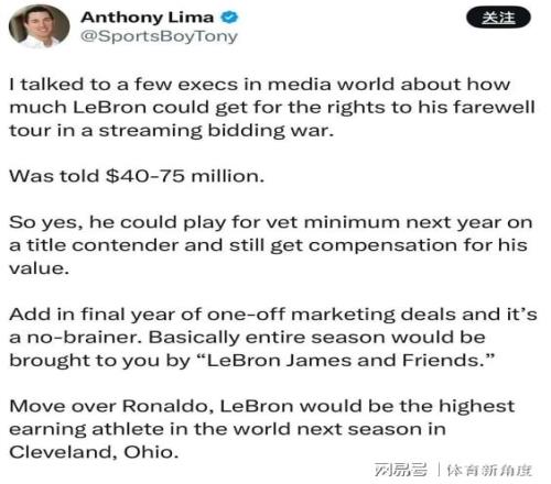 今日,克利夫蘭當地的媒體人Anthony Lima,在談及詹姆斯下賽季的去向時,更是語出驚人:“我與幾位傳媒界的大佬深入交流了一番,探討了勒布朗退役巡演的轉播權,在流媒體平臺上的競價大戰中,他個人究竟能斬獲多少真金白銀。據我所知,這個數字,將是一個天文4000萬至7500萬美元之間。
