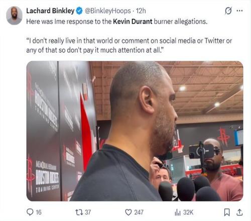 杜蘭特在訓練后接受采訪談到近期的疑似小號風波,他說道:我根本不想卷入推特上那些無稽之談,我的隊友們都知道怎么回事,我和火箭隊整個賽季都在全力以赴。