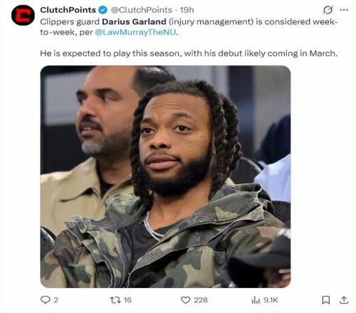 北京時(shí)間2月19日,根據(jù)快船記者勞里-穆雷的報(bào)道,達(dá)柳斯-加蘭目前還無法進(jìn)行對(duì)抗訓(xùn)練,他的腳趾還在康復(fù)中,他腳趾手術(shù)的傷口還沒有愈合,所以他的復(fù)出時(shí)間還需要視每日的觀察而定,預(yù)計(jì)加蘭最快也要三月份傷愈后首次登場(chǎng)。