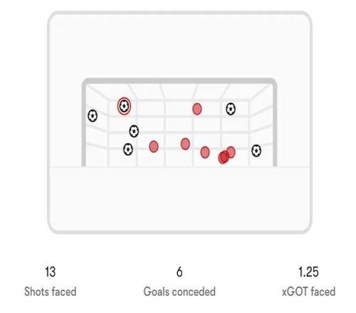這并非偶然。本賽季英超,阿森納門將總共面對13次禁區外的射門,其中6次轉化成了進球。按照Opta的預期進球模型,根據射門角度、速度和門將位置,拉亞本應只丟1到2球,但他實際丟了6個。