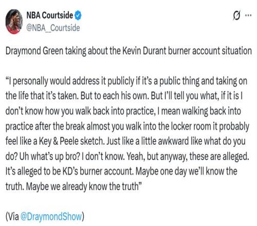 “所以如果是我,我會公開回應。但每個人處理方式不一樣。不過說實話,如果真是他的小號,全明星假期后回去訓練、走進更衣室,那場面估計會超級尷尬,氣氛都不對了。當然,這些目前都只是傳聞,只是說這個小號疑似屬于杜蘭特。也許有一天我們會知道真相,也許我們其實已經知道了,誰知道呢。”