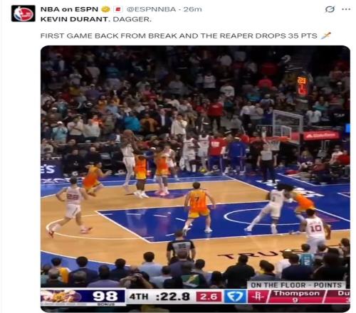 就連NBA官方都說杜蘭特此役就如同利刃出鞘一般斬獲35分。